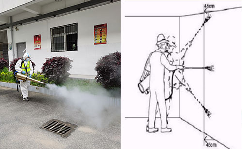 噴霧技術(shù):掛流狀態(tài); 1、橫向噴灑幅度為75 cm; 2、左右幅度間應(yīng)有5 cm的重疊; 3、自上向下噴灑; 4、首先自上向下噴灑,結(jié)束一個(gè)噴灌噴 灑幅度 后,順時(shí)針橫移,開(kāi)始下一個(gè)幅度噴灑; 5、保持噴嘴距離墻面45 cm; 6、開(kāi)始噴灑時(shí)首先向前傾斜,當(dāng)噴嘴向下噴灑時(shí),身體向后傾斜; 7、自時(shí)口順時(shí)針操作,直至房間處理完畢; 8、對(duì)人體接觸較多的柜臺(tái)、桌椅、門(mén)把手、水龍頭等可用0.2%-0.5%過(guò)氧乙酸溶液或有效氯為500mg/L-1000mg/L的二氧化氯消毒劑進(jìn)行噴灑或擦拭消毒,作用時(shí)間15-30分鐘。